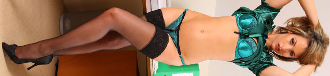 Blonde Secretary Anastasia Harris posing in the office in sexy green Lingerie and Stockings.
