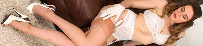 Racy Samantha posing in black seamed ff nylons, white lingerie and peep toe heels.