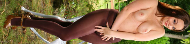 Carla - Brunette outside wearing a long yellow skirt and brown top with brown pantyhose