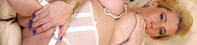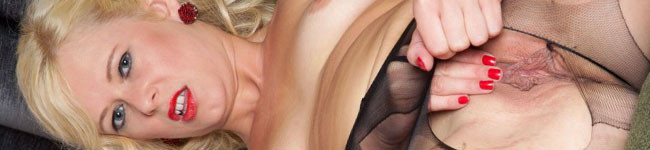 Glamorous MILF Jan Burton wanks in seamed nylons