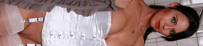 German MILF Desyra Noir looks sexy in white satin corset Plateau Heels and shiny fully fashioned nylons.