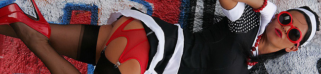 Sexy Lady Eve dressed with a short leolook skirt and a sexy hat. Eve is wearing a lovely sheer pair of tan stockings with black seem. See her in some hot poses and not wearing some panties under her satin garter belt.