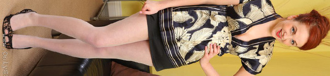 Raunchy Kelly getting frisky in sexy sheer, nude nylons and yellow mini!.