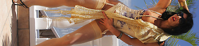 Ashley's formal attire is a sharp contrast to her tropical, sunny paradise setting. Her black stockings, black patent leather heels and garters bring a saucy touch of old-school British erotic-glamour fetish. This is what English models wore 60 years ago posing for erotic photographers hidden away in second-floor studios. She looks like she is ready to play the piano in concert. In fact.. "I like to play sometimes," Ashley said.