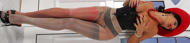 A Seamless sheer pantyhose from Wolford over some fully fashioned stockings in red and in black do look so sexy on Eve. Eve loves also to wear a tight corset and of course always some high heels as here some black mules! See Eve in some hot posings and finally ripping her pantyhoses so her fingers can reach her pussy directly.