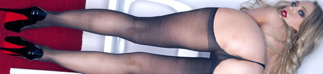 Blonde Michelle in leather skirt, black ff stockings and sheer panties!.